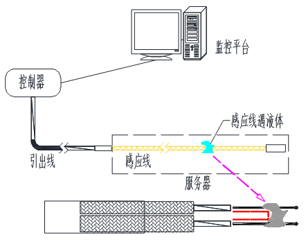 當有液體與液冷感應(yīng)線接觸時,液體浸入感應(yīng)線編織層,使兩根感應(yīng)線芯遇液體導通,形成回路,測漏控制器檢測到漏液情況,發(fā)出報警信號。