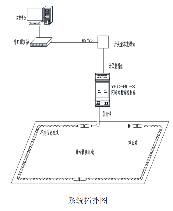 控制器 YEC-ML-S 與感應(yīng)線(xiàn)連接,通過(guò)開(kāi)關(guān)量信號(hào)輸出將泄漏情況數(shù)據(jù)匯集至開(kāi)關(guān)量模塊,轉(zhuǎn)換成RS485 信號(hào)傳輸至上位機(jī)??刂破骼^電器輸出信號(hào)可用來(lái)控制外圍設(shè)備如聲光報(bào)警器、電話(huà)撥號(hào)器、
