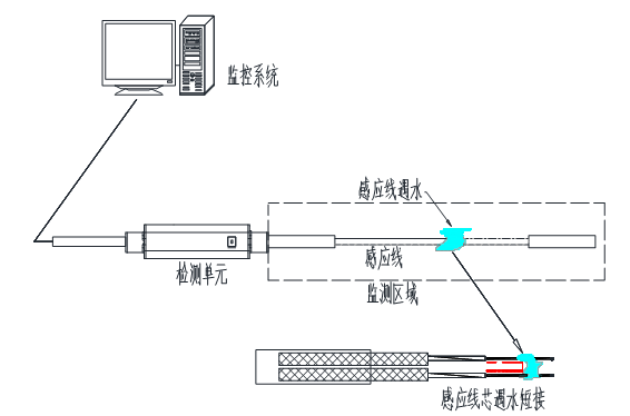 當(dāng)有液體與液冷感應(yīng)線接觸時(shí),液體浸入感應(yīng)線編織層,使兩根感應(yīng)線芯導(dǎo)通,形成回路,檢測(cè)模塊檢測(cè)到漏液情況,發(fā)出報(bào)警信號(hào)。